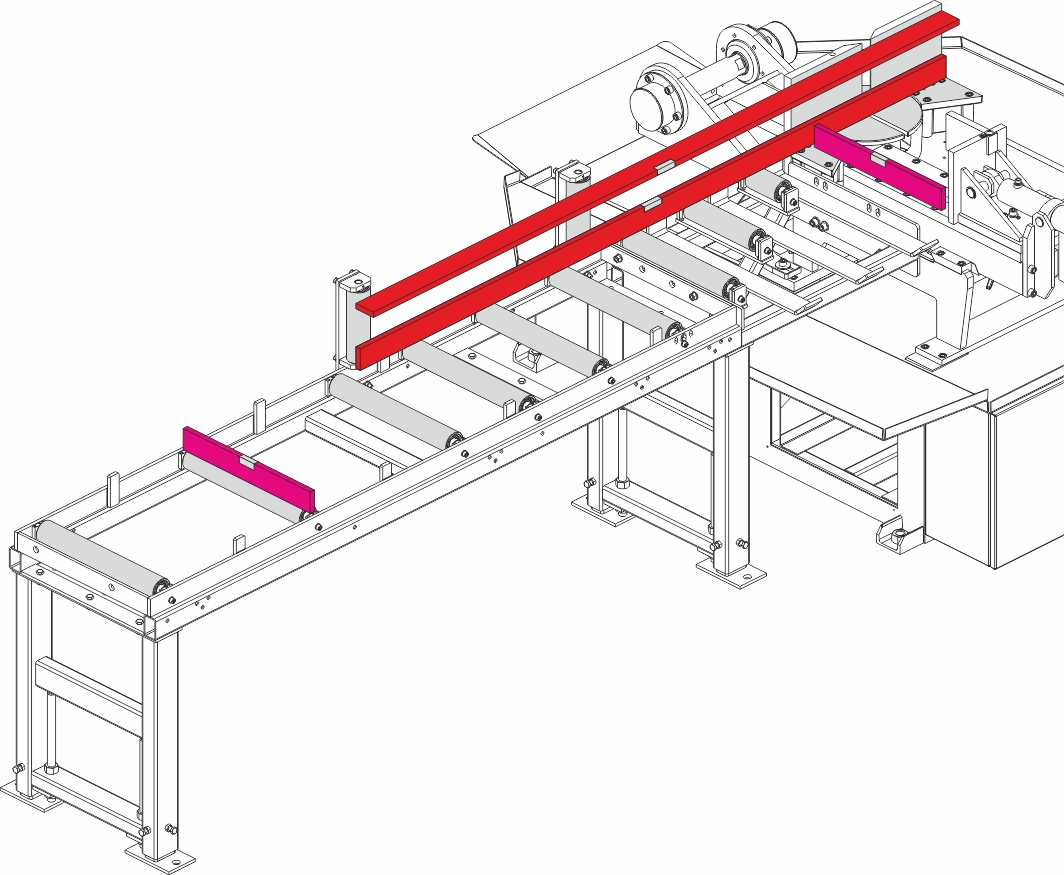 Unterlegen Sie die Maschine in den Ecken mit Blechen und verankern Sie sie am Boden. Richten Sie anschließend den Förderer mit der Maschine mittels eines langen Lineals und einer Wasserwaage aus. Überprüfen Sie bei jedem Förderabschnitt alle Rollen, ob sie das aufgelegte Lineal berühren, und passen Sie gegebenenfalls ihre Lagerung an. Richten Sie jeden Abschnitt mit den ausziehbaren Füßen auf die Ebene des Maschinentisches aus. Vergessen Sie nicht, den Förderer in beiden senkrechten Achsen auszurichten. Für längere Förderstrecken ist eine Laserwasserwaage geeignet. Wenn Tisch und Förderer ausgerichtet sind, verankern Sie die Förderer. Hilfreiches VIDEO HIER