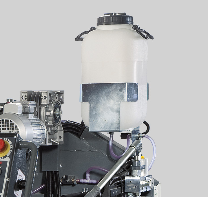 The cooling system consists of a pressure pump in the coolant tank, flow control solenoid valve and two-way jets that spray the sawmill blade both from below and from above. Double-side cooling prevents undesirable stress in the saw band and adhesion of resin from underneath the sawmill blade and thus helps maintain stabler sawmill blade operation, more accurate cut and longer service life. Integrated in the cooling system is an electromagnetic through-flow valve, which automatically opens when the saw blade is started and closes when the saw blade is stopped. It substantially lowers the coolant consumption and saves time needed for replenishment of coolant liquid.