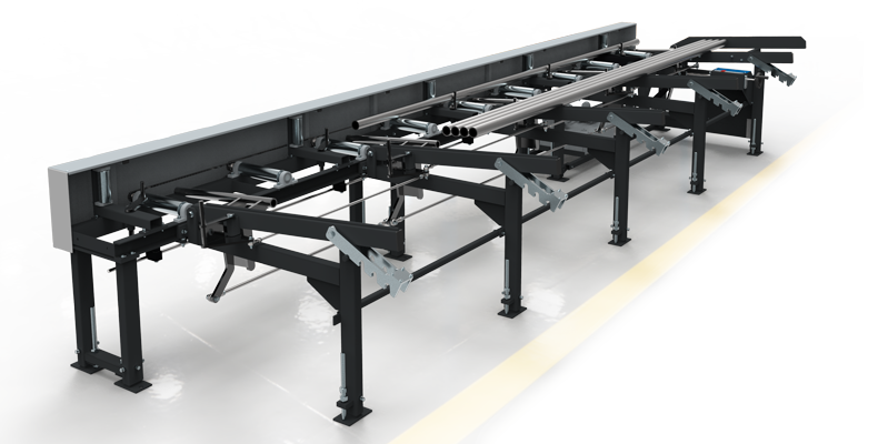 Následně je spuštěna válečková dráha plynule pomocí frekvenčního měniče, která dopraví materiál přesně do čelistí podávacího svěráku. Po detekci materiálu systém automaticky provede jeho upnutí a přesné napozicování do hlavního svěráku pomocí PMG snímáče a plynule pokračuje v řezacím cyklu dle programového zadání obsluhou. Během posuvu materiálu je rychlost válečkové dráhy plně synchronizována s pohybem podávacího svěráku, aby nedocházelo k nežádoucímu sunutí materiálu po válečcích a jeho poškození. Celý proces probíhá zcela automaticky bez nutnosti zásahu obsluhy.
